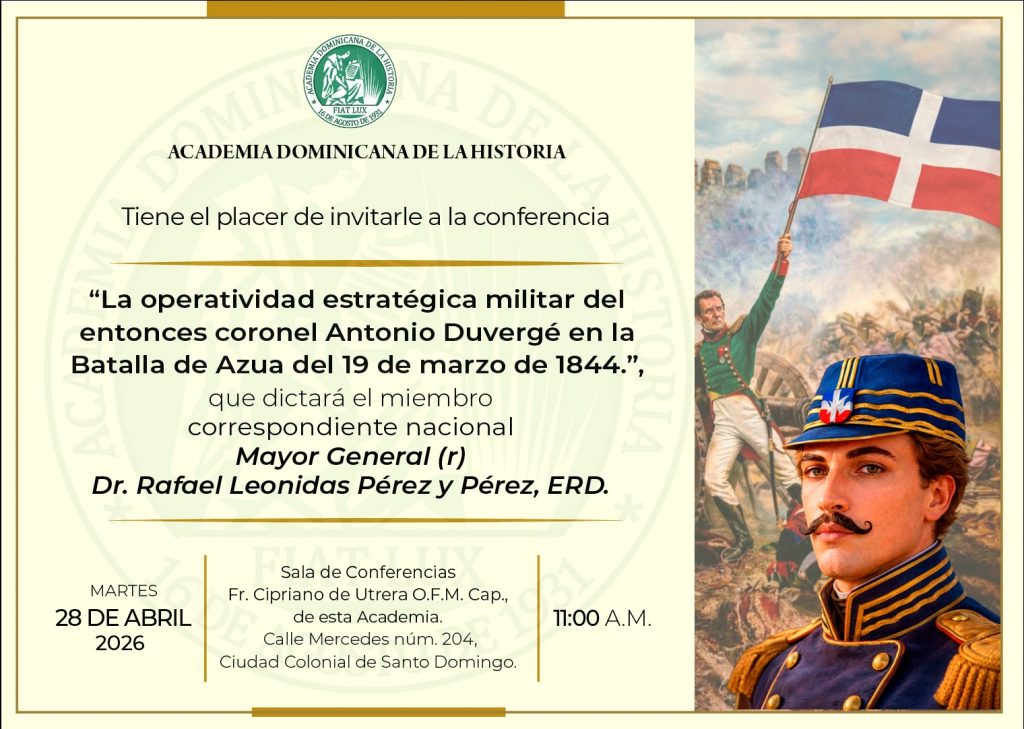 Invitación a la conferencia «La operatividad estratégica militar del entonces coronel Antonio Duvergé en la Batalla de Azua del 19 de marzo de 1844», que dictará el miembro correspondiente nacional Mayor General (r) Dr. Rafael Leonidas Pérez y Pérez, ERD.